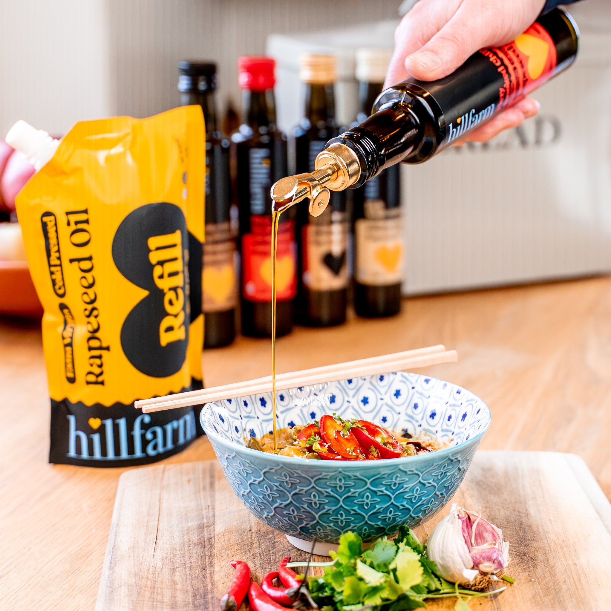 Ignite your senses with our Fiery Smoked Chilli Cold-Pressed Rapeseed Oil. Infused with natural chilli and delicately smoked over oak and applewood, it adds instant heat and rich smokiness to any dish.